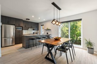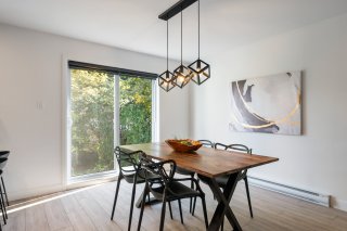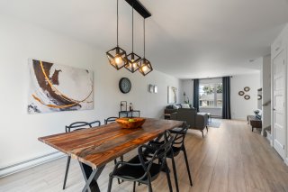 - Une salle à manger chaleureuse avec porte-patio menant vers la cour arrière.