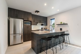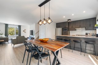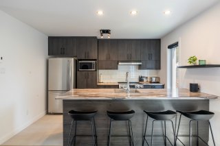 - La cuisine moderne se démarque par son îlot central avec comptoir-repas, de nombreux cabinets et un style contemporain parfait pour vos repas quotidiens.