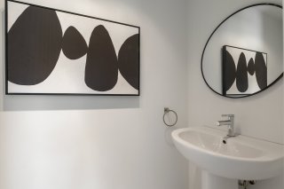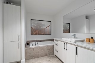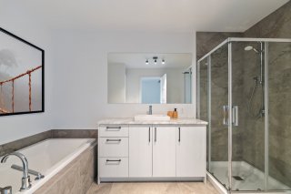 - La salle de bains familiale propose une baignoire podium et une douche vitrée, combinant élégance et praticité.